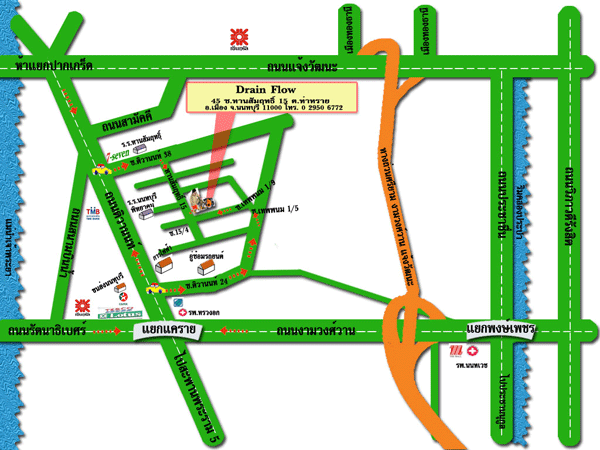 Drain Flow 45 ถนนติวานนท์ ต.ท่าทราย อ.เมือง จ.นนทบุรี 1100 โทร 02 950 6772 , 089 561 8000, 089 120 8001 โทรสาร 02 589 8258